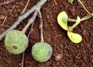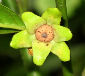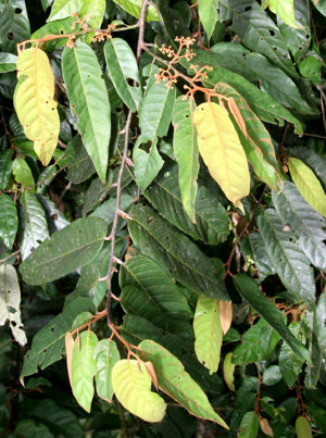 Description: The Annonaceae are mainly trees, with a few lianas. They have simple, alternate, entire leaves with no stipules. In almost all species here, the leaves are distichous (borne in one plane), and the young leaves are conduplicate (i.e., folded in half lengthwise). The crushed leaves have a strong odor, which varies from fruity to unpleasantly sour. The bark is very strong, often peeling down the trunk when you attempt to remove a twig. The underside of the bark has a netted pattern, also visible in the wood, and the stem cross section has abundant rays, resembling a bicycle wheel.