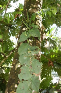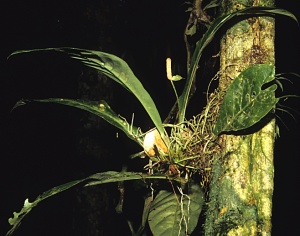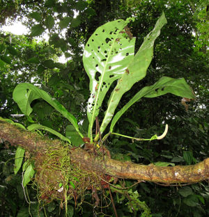 Description: A large and important family of herbaceous plants in the Neotropics, with many climbers and hemiepiphytes. The leaves are alternate, simple to palmately compound, and usually entire. Unlike most monocots, aroids can have reticulate venation (i.e., the veins form a network). Many species have caustic and/or foul-smelling latex. The inflorescence is unmistakable: a spadix (a stalk of many tiny, closely appressed flowers) subtended by a spathe (a single large, sheathing bract). Vegetatively, the family can usually be identified by its more or less succulent leaves and petioles, and the glossy sheen of its leaves. A good key to the aroid genera of La Selva Biological Station can be found in the OTS 96-9 course book, page 95 (available in the La Selva library).