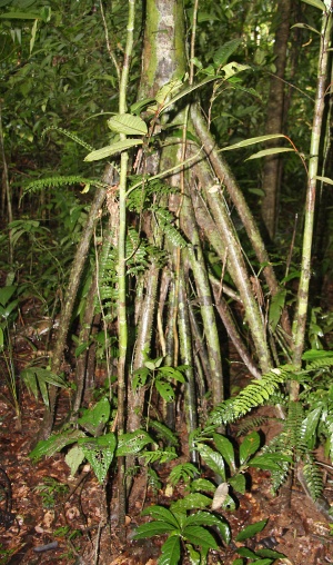 Description: Arecaceae have leaves that are simple, or pinnately or palmately compound, always with strongly parallel venation. They are trees or shrubs with unbranched trunks (sometimes acaulescent, i.e., stemless), and one (Desmoncus) is a liana. They can be confused with cyclanths, but there are easy ways to tell the families apart (see the description of Cyclanthaceae). Arecaceae are an important component of tropical forests worldwide. In old-growth forests of the Zona Norte, palms are common in both the understory and the canopy.