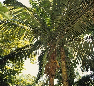 Descripción: Las Arecaceas tienen hojas simples o compuestas, palmadas o pinnadas, siempre con las venas paralelas. Son árboles o arbustos con troncos no ramificados (a veces sin troncos), y un género (Desmoncus) es un bejuco. Las palmas se puede confundir con las Cyclanthaceas, pero hay unas características que se puede usar para distinguirlas fácilmente (vea la descripción para las Cyclanthaceas). Las Arecaceas son un componente muy importante en los bosques tropicales de todo el mundo. En bosques madurosde la Zona Norte, las palmas son comunes tanto en el sotobosque como en el dosel.
