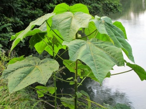 Ochroma pyramidale “balsa” – huge cordate leaves, large stipules shaped like the seat of a racing bicycle, very short internodes (leaves closely spaced), stringy mucilage, stellate hairs, huge white flowers