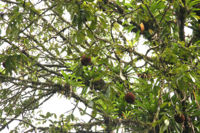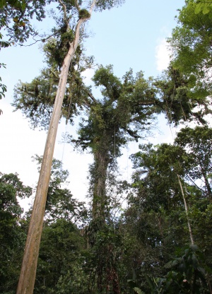 Description: All of the Bombacaceae are trees, and most of them are large emergents with columnar trunks (i.e., not buttressed) and flat, spreading branches. Some have spiny trunks. The leaves are 3-veined (i.e., with three palmate veins at the base), palmately lobed, or palmately compound. The 3-veined genera (here, Quararibea) are difficult to separate from Malvaceae by vegetative characters. Fruit or flowers may be necessary for a positive identification. Bombacaceae almost all have large, white, night-blooming flowers that are pollinated by bats.