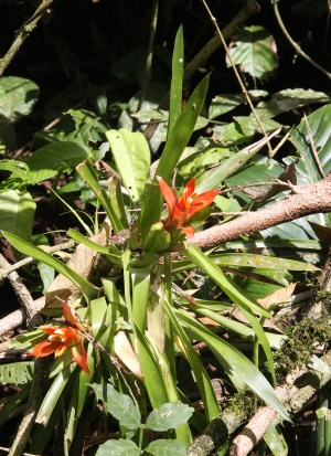Descripción: Las Bromeliaceas usualmente son epifitas, pero algunas son terrestres. Las bromelias se reconocen por sus hojas con venas finas y paralelas, usualmente formando una roseta densa. Muchas veces hay agua atrapados en las cuencas formadas por la base de las hojas. En estas cuencas viven larvas de zancudos, planarias, renacuajos, y otros animales interesantes (Richardson et al. 2000).