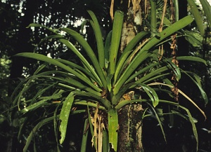 Description: Bromeliaceae are primarily epiphytic, but some are terrestrial. They are recognizable by their closely parallel-veined leaves and their dense rosette growth form, often with pools of water trapped in the leaf axils. These pools provide habitat for mosquito larvae, tadpoles, flatworms, and a host of other interesting flora (Richardson et al. 2000).