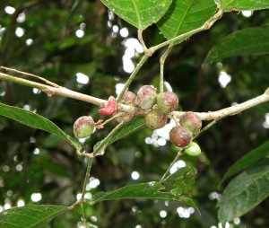 Descripción: Las Burseraceas tienen el olor más fuerte de los Sapindales. Es un olor fuerte y agradable a incienso evidente al rasgar levemente una hoja. Todas las especies y casi toda la familia aquí en La Selva, tiene hojas pinnaticompuestas. El género más común aquí, Protium, es muy fácil de distinguir: cada peciolulo de cada foliolo es pulvinulado en los dos extremos. ¡Los frutos de Protium tienen tanto aceite que se les puede encender!