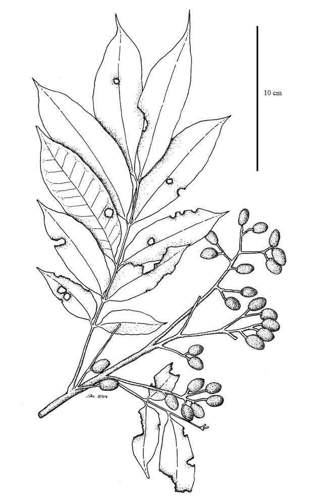 Tapirira guianensis Aubl., a tree in the Anacardiaceae. Note how the veins bifurcate just before reaching the margin. Many anacards have similar, mango-like fruit. Un árbol. Note que las venas se dividen en dos antes de alcanzar la margen. Muchas Anacardiaceas tienen frutos similares, muy parecidos a los mangos.