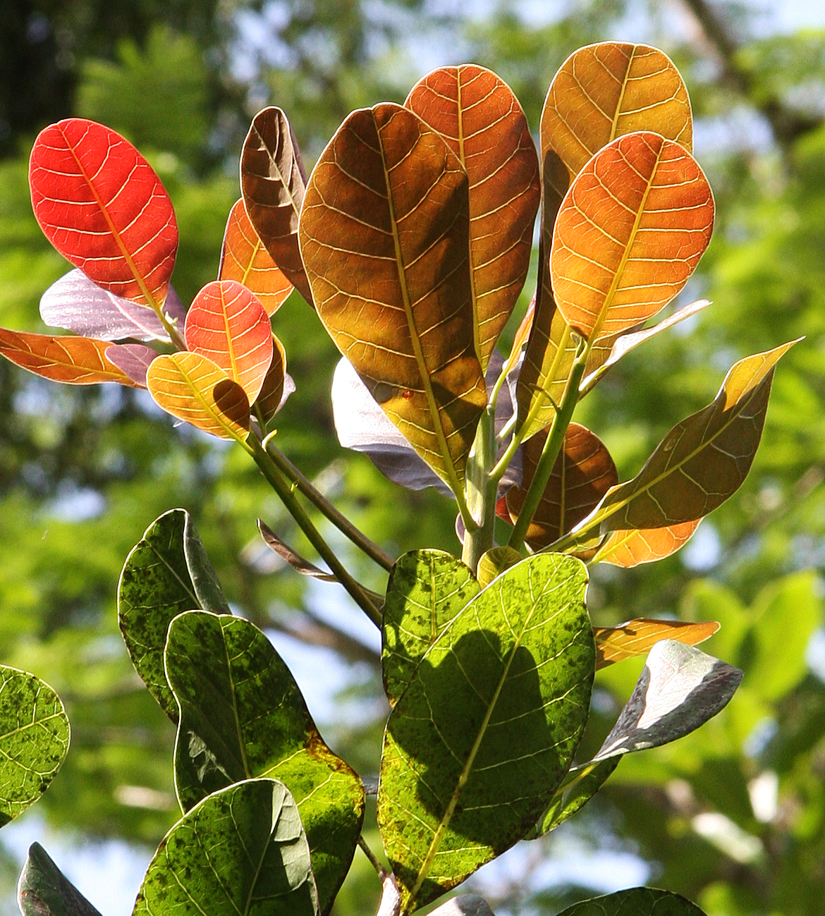 Anacardium occidentale (Cashew) - simple leaves with red color in young leaves.