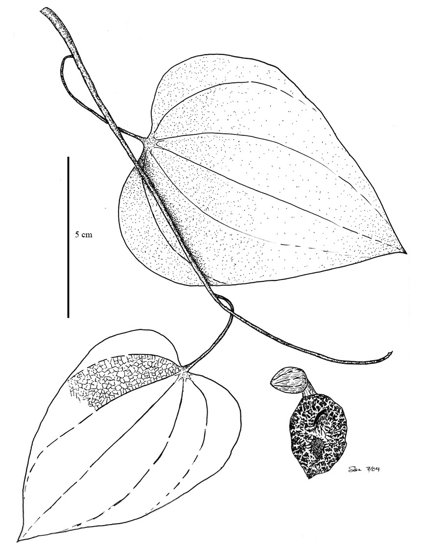 Aristolochia cruenta Barringer, a canopy liana in the Aristolochiaceae. Note the irregularly netted tertiary veins in the leaf, the long, curving petioles, and the mottled raw-meat appearance of the flower. Un bejuco que crece al dosel. Note la venación terciaria irregular, los pecíolos largos y flexibles, y la flor con apariencia moteada similar a carne podrida.