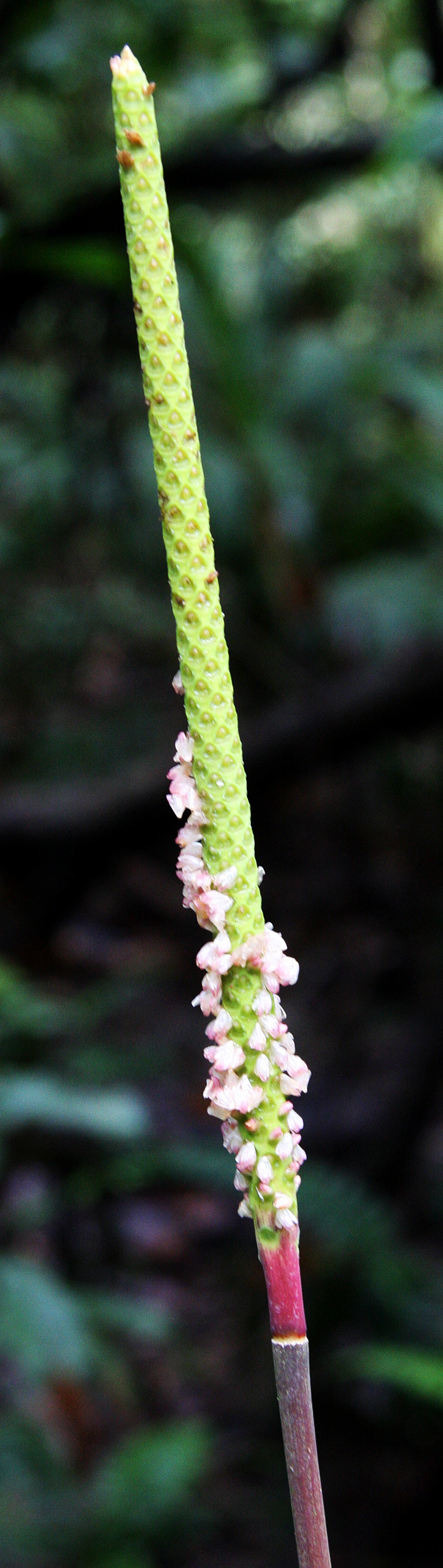 The inflorescence of Calyptrogyne consists of a tall unbranched spike with a distinct ring-shaped scar left behind by the spathe. The inflorescence on the left is bearing flowers while the one on the right is maturing fruits.