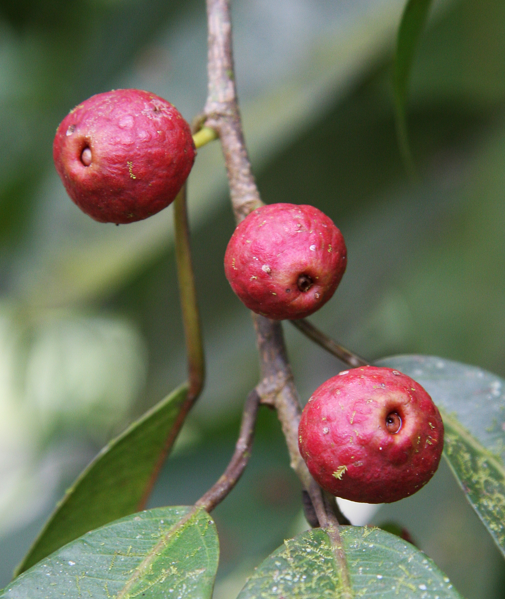 Fig fruits, properly called syconia, are like hollow balls with an opening that leads to the flowers, or developing seeds, concealed within.