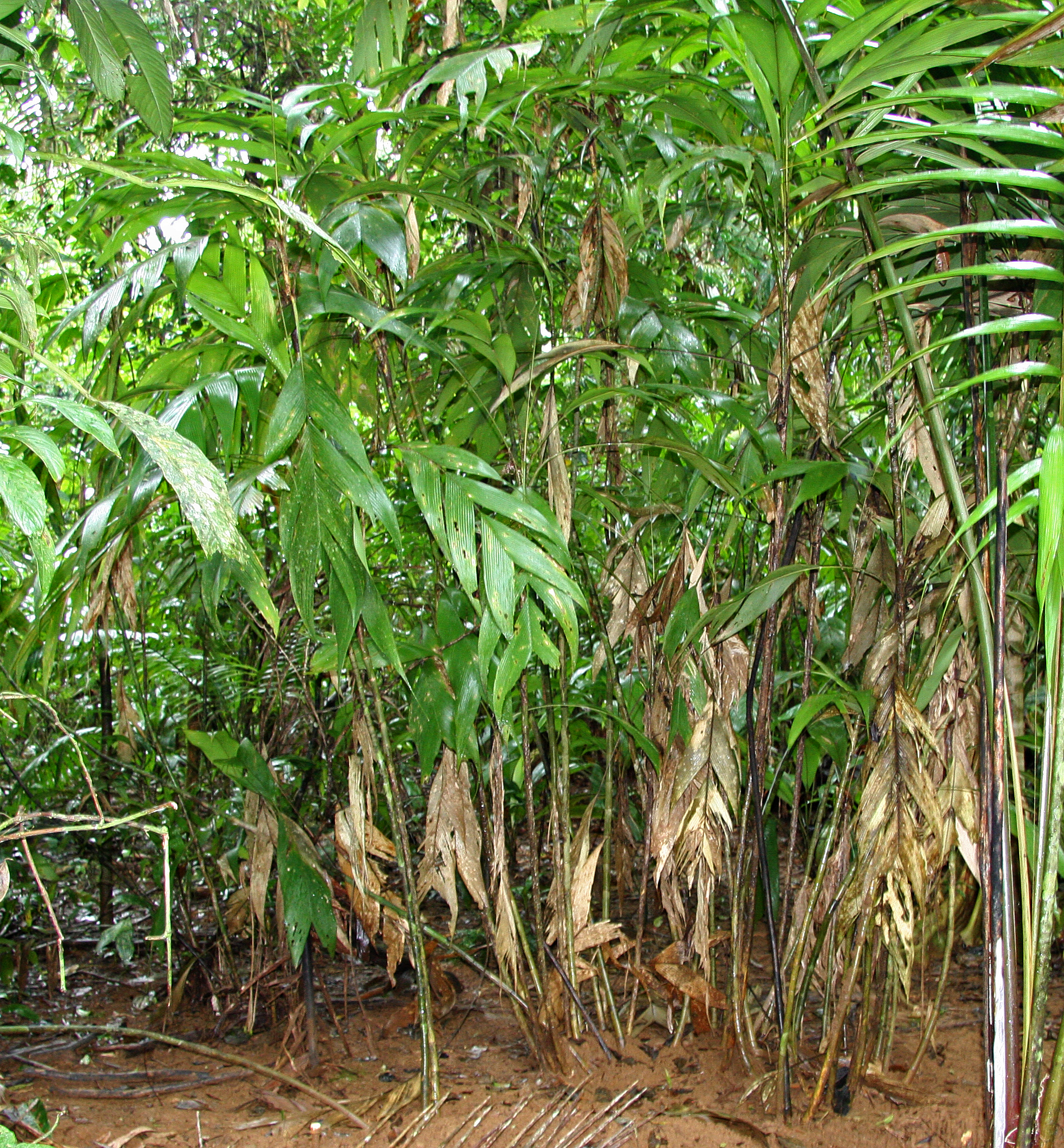 A Geonoma congesta clone typically consists of 10-20 closely spaced stems.