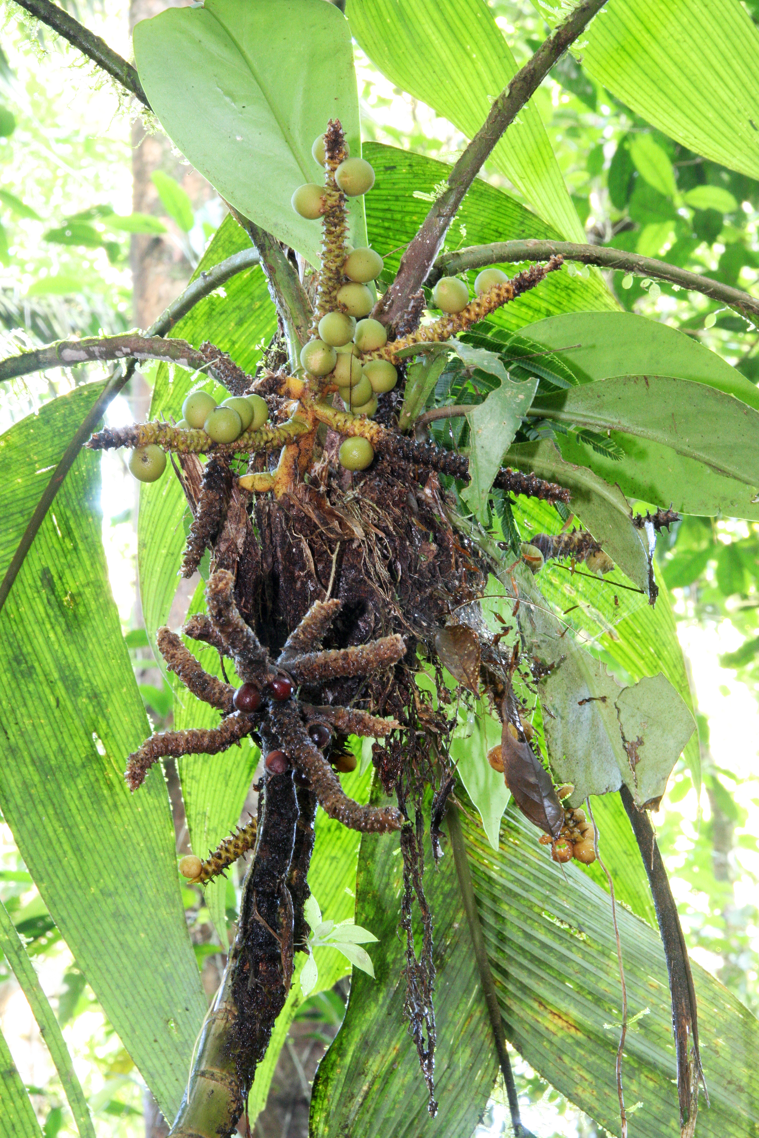 Branching inflorescence of Geonoma congesta. Note that the flower spike is orange and that fruits become black as they ripen.”