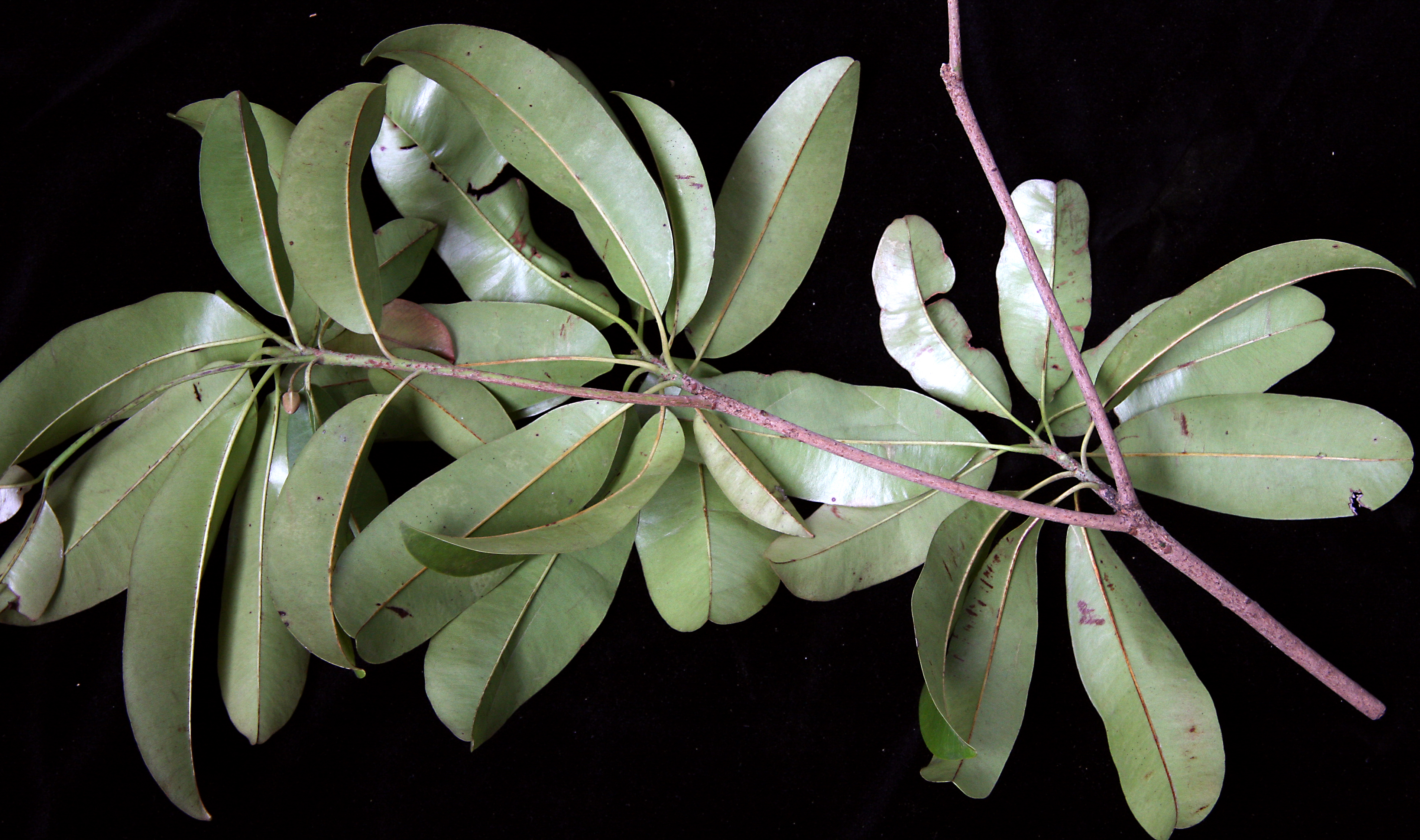 Obovate leaves (shaped like an upside down egg) clustered at branch tips and sympodial branching. Sympodial branching occurs when the apical meristem ceases to function and a new stem forms below the old one, forming a pattern of repeated loops resembling a child’s drawing of waves on the ocean.
