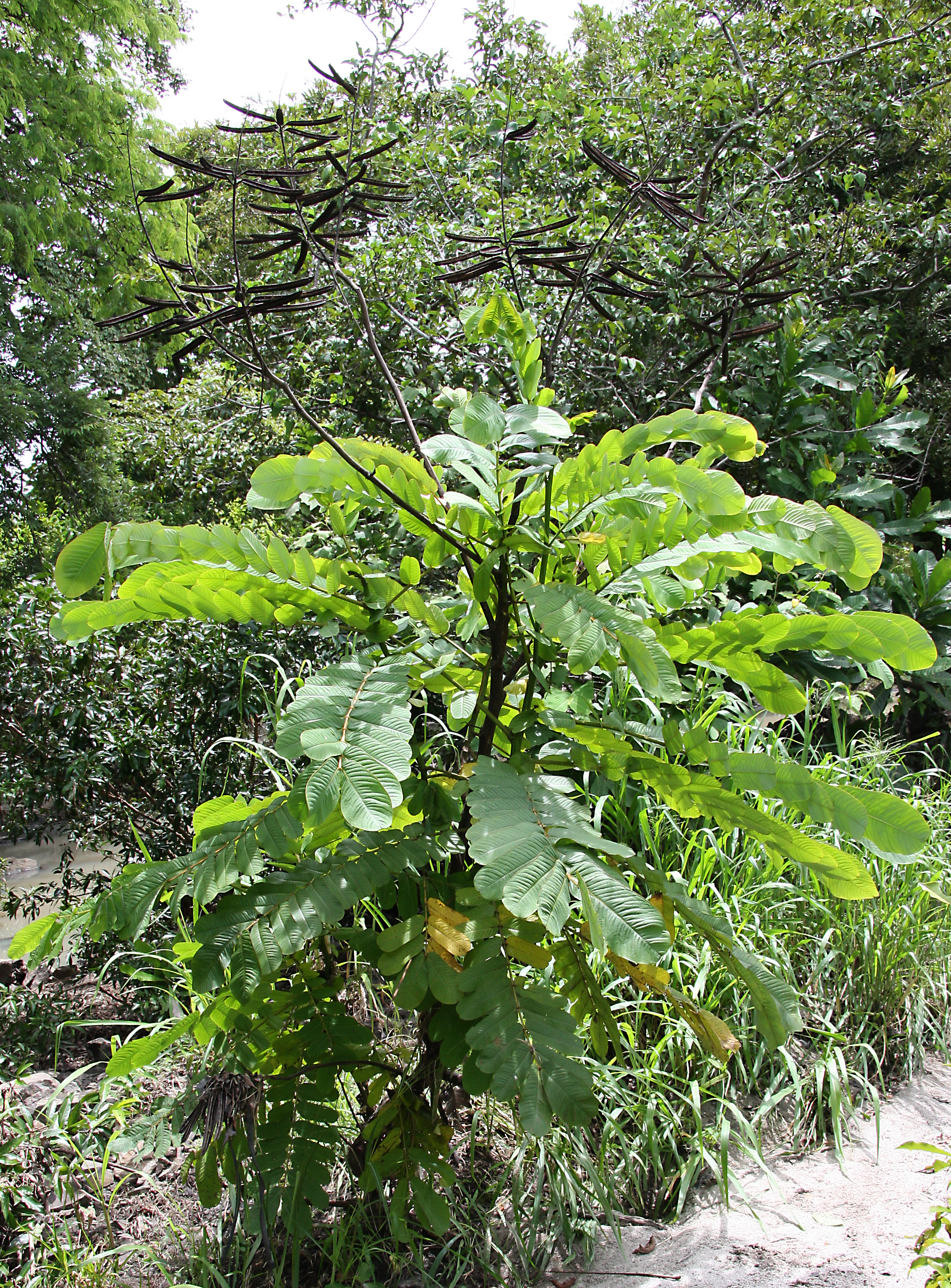 Senna alata showing paripinnate leaves with nectaries between leaflets and small tree with fruits.