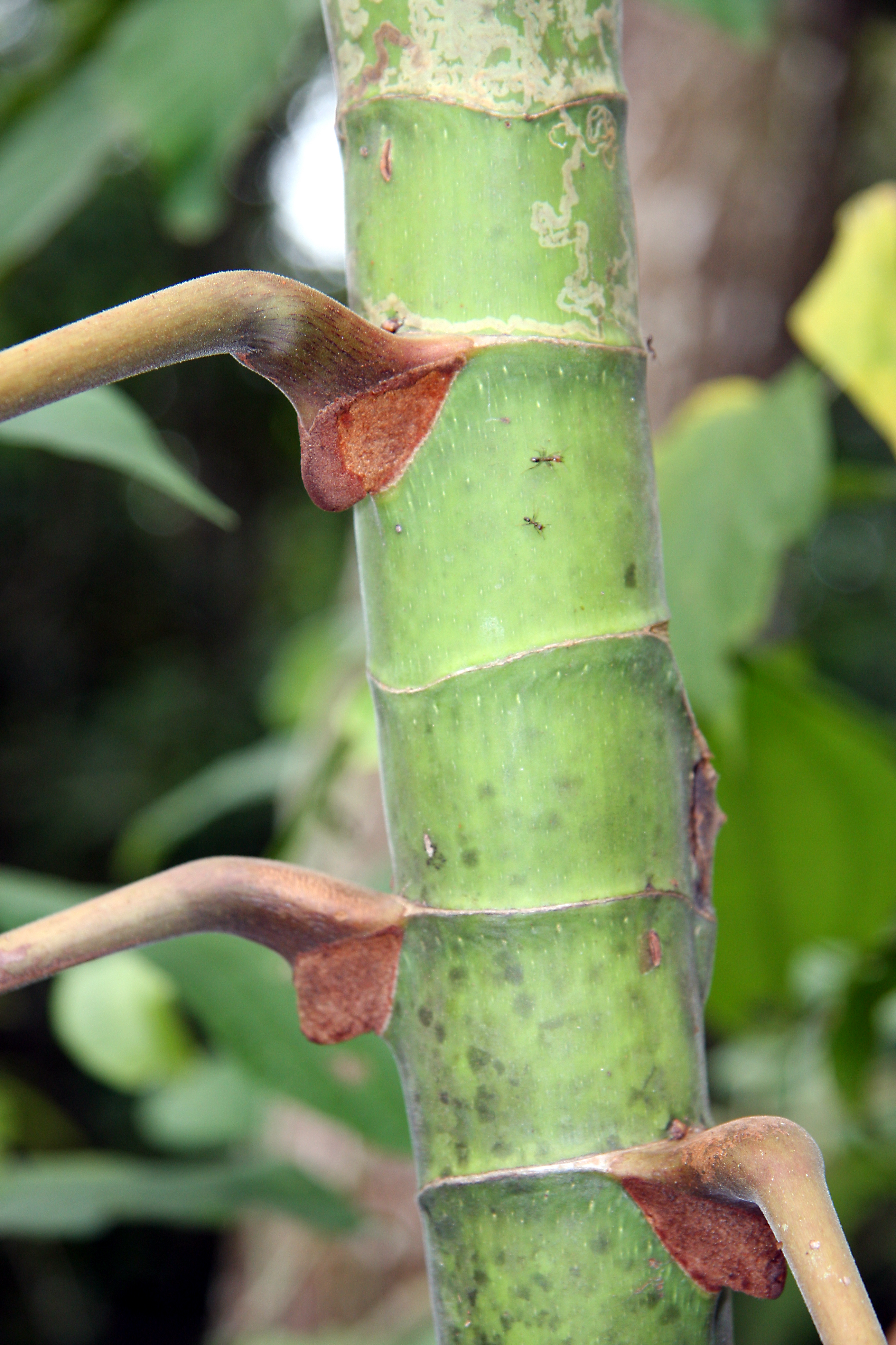 Cecropia trunk with Azteca ants. The brown area below the petioles contain food bodies for the ants.