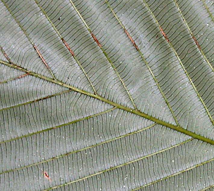 Pourouma leaf showing characteristic parallel seconday veins with parallel wavy tertiary veins.