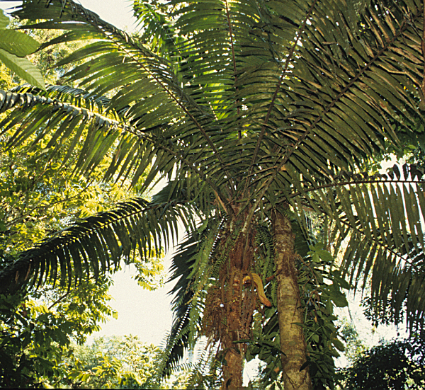 The subcanopy palm Welfia georgii is one of the most common trees at La Selva and is readily distinguished by long antler-like inforescences that bear an unsettling resemblance to snakes after they fall to the ground. Worse yet is the fact that mice consume the fruits that fall to the ground, thereby attracting bushmasters (real snakes) to the areas around these palms.