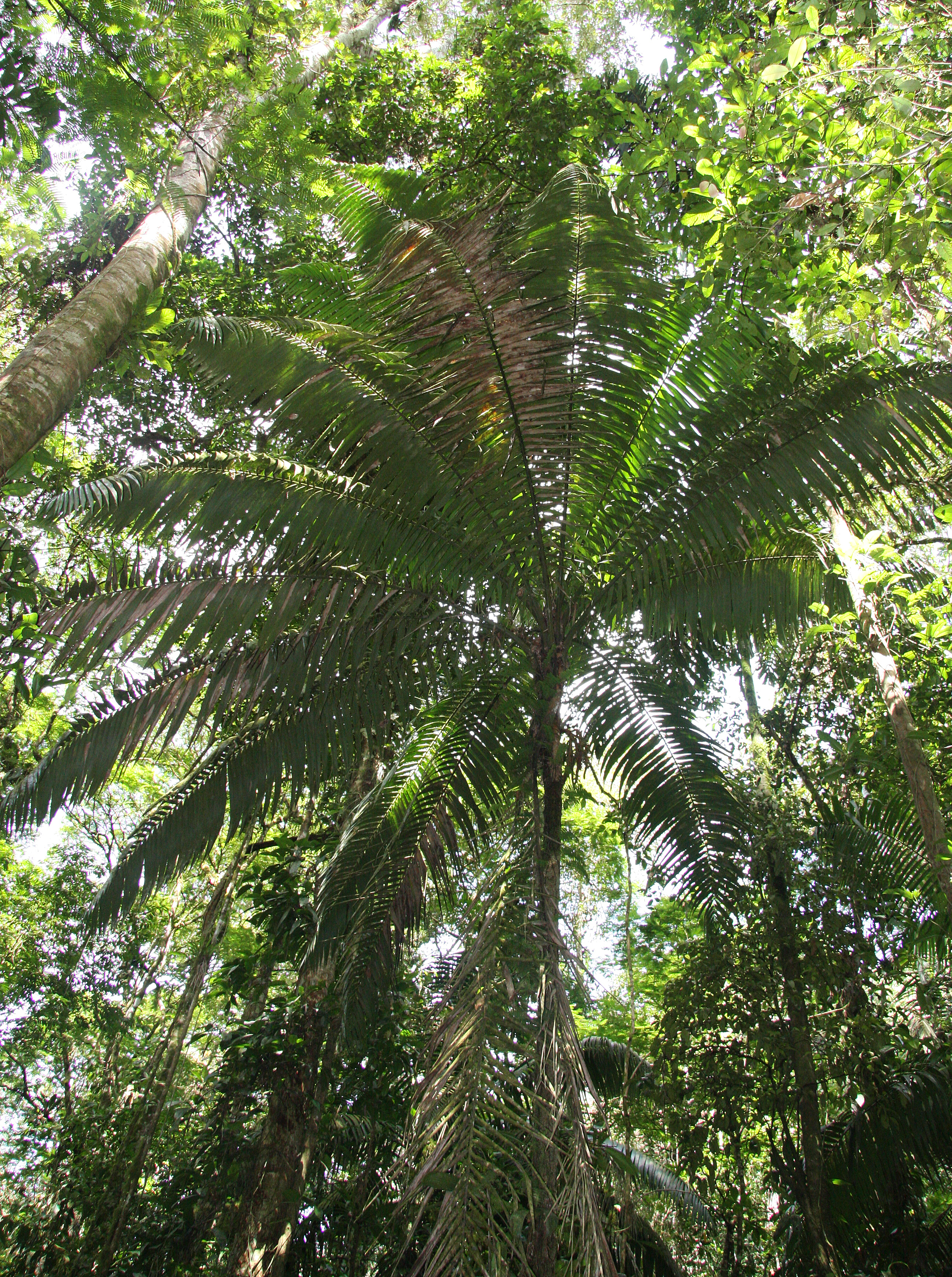 Welfia regia is a large subcanopy palm (to 25 m tall) with very large pinnate leaves (to 6 m long) and prominent leaf scars ringing the trunk.