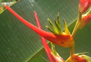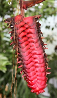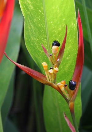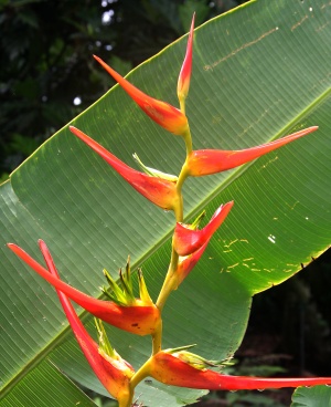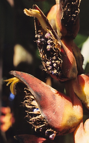 Description: Heliconiaceae have simple, alternate leaves that are often very large. The leaf veins are perpendicular to the midrib, and the petiole is channeled. The leaves tear easily; plants growing in the wild usually have leaves that are somewhat tattered. The leaf sheath around the stem is often partly open at the top. The inflorescence, borne at the end of the stalk, can be either pendant or upright. The bracts of upright-flowered Heliconiaceae harbor unique communities of insects, snails, and microorganisms, much like the leaf axils of bromeliads, but the species compositions of the assemblages in Heliconia bracts and bromeliad leaf axils are very different (Richardson et al. 2000).