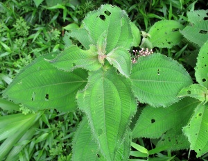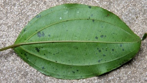 Description: A family of trees, shrubs, herbs, and occasionally lianas, with simple opposite leaves with a very characteristic venation pattern. The main veins (usually 5-9) are palmate at the leaf base, and the secondary veins between them are scalariform (i.e., parallel and regularly spaced like a ladder). Many species have abundant trichomes, and several understory herbs in the family have ant domatia in their leaf bases. Some Melastomataceae (particularly Mouriri) can be confused with Rubiaceae (particularly Faramea), but Rubiaceae have conspicuous interpetiolar stipules (see the illustration for Rubiaceae, or p. 722 in Gentry 1993). Identifying melastomes to family is very easy, but genera and species can be extremely hard to identify. Most are defined by fruit and floral characters.