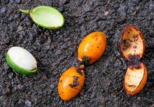 Myristicaceae fruits are dispersed by both birds and mammals. Here at La Selva, spider monkeys (Ateles geoffryi) and toucans (Ramphaistros spp.) are particularly important dispersers of Virola.
