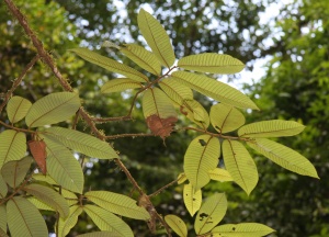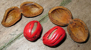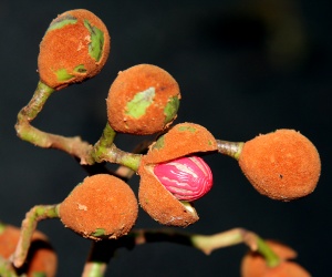 Virola – 2-ranked leaves (distichous) with prominent veins, fruit that splits to reveal a lacy red aril surrounding a single large seed.
