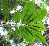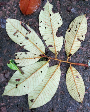 Description: A family of medium to large trees, all characterized by simple, alternate leaves without stipules, and sap that oxidizes to a reddish color (blot it onto a piece of paper and wait for up to several minutes). The leaves are almost always distichous, and have a spicy odor when crushed. Many species also have stellate (star-shaped) hairs, visible through a hand lens. The most distinctive character of the Myristicaceae is their branching pattern. Many branches are produced at once, emerging in a whorl around the trunk, which gives the tree a pagoda-like architecture.