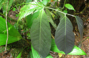 Description: Recent molecular phylogenies have shown Polygalaceae to be the sister group (i.e., the most closely related extant group) to the Fabaceae (Stevens 2005). Polygalaceae have simple, alternate, entire leaves, often with a pair of tiny glands at the petiole base. There are only three species of Polygalaceae at La Selva, but I have decided to include the family because it contains the most abundant liana species here. The three species are fairly easy to distinguish: