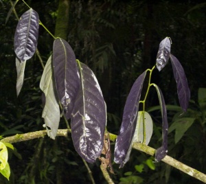 - The other two genera are both canopy lianas. Moutabea gentryi, although it is the most abundant liana species in old growth forest at La Selva (Mascaro et al. 2004) was not described as a separate species from the Amazonian Moutabea aculeata until 2000. It has large, thick, glossy leaves up to 30 cm long, generally distichous, with a pair of minute glands at the base of the petiole. The small twigs have inconspicuous prickles. The young leaves are a very unusual blue color. Securidaca diversifolia is not very abundant here. It has much smaller leaves than Moutabea (4-10 cm), but also distichous and with glands at the petiole base. The young twigs of Securidaca often act like tendrils, twining around supports. The young leaves are not bluish.