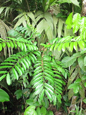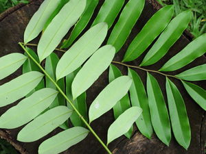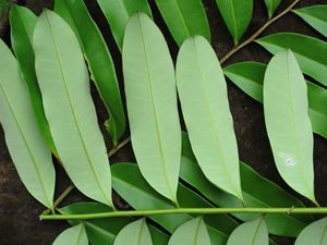 Description: There is only one species of Simaroubaceae at La Selva, Simarouba amara, but it is common enough and distinctive enough to bear mentioning. It has alternate, pinnately compound leaves with a terminal leaflet. The leaflets are oblong, with a glossy green surface and a white underside, and the secondary and tertiary veins are very indistinct. A character often noted in this species is the extremely bitter bark; the Spanish name hombre grande may allude to the bravery it takes to sample the bark. Simarouba amara is the host plant for the famous peanut-headed lanternfly or machaca (Fulgora laternaria; see Janzen 1983).