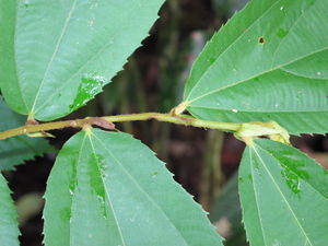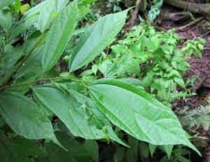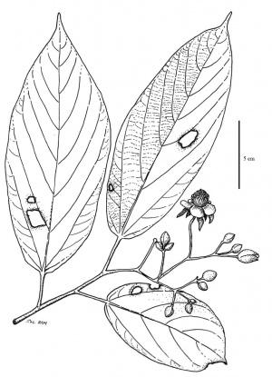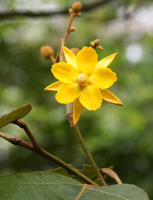 Description: Tiliaceae are mainly canopy trees, especially prevalent in second-growth forest. Most of them have yellow flowers with many free stamens, and each genus has a distinctive and often bizarre-looking fruit (e.g. the “sea urchin” fruit of Apeiba membranacea). Vegetatively, Tiliaceae are hard to distinguish from other Malvalean families. Several leaf characters are important for identification. The genera here have leaves that are always simple and unlobed, and usually serrate. Most of them have a contrasting leaf underside (whitish or brownish).