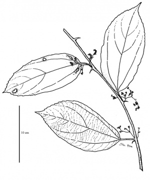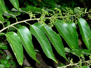 Description: This is one of the few families that are more diverse and important in the temperate zones than in the tropics. Ulmaceae are characterized by simple, alternate leaves with asymmetric bases and stipules. Most species have strong bark, though not as strong as Annonaceae. Almost all Ulmaceae have toothed leaf margins; Celtis schippii is the only exception at La Selva. Two of the five species here are lianas: Celtis iguanaea has toothed, non-asperous leaves and spines, while Celtis schippii has entire, asperous leaves and no spines. Ampelocera macrocarpa, an understory tree of old-growth forest, has large, glossy leaves with very obscure teeth and conspicuously asymmetrical leaf bases. The two Trema species are understory trees, common in secondary forest or disturbed areas.